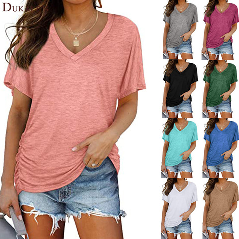 נשים קצר שרוול V צוואר קפלים T חולצות קיץ Loose Fit בסיסי טוניקת עם צד כיווצים מקרית למעלה Tees כותנה אימון למעלה